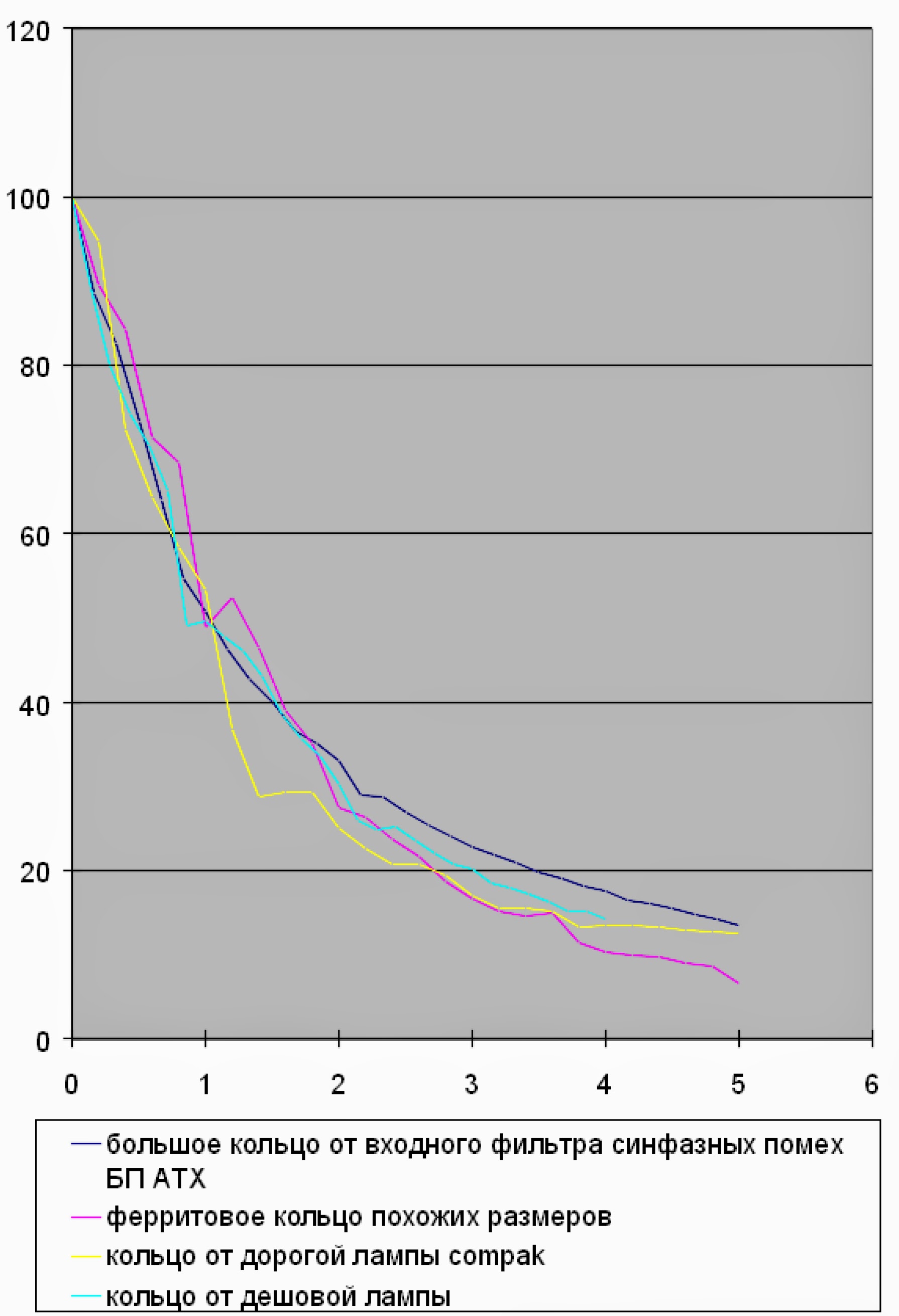 Как видно, все графики практически совпадают, кроме графика для кольца от лампы compak: у лампы компак на отрезке от 4 до 5 график идет практически горизонтально и между 1 и 2 есть явный изгиб графика.